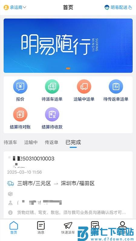 明易随行手机版为贸易配送管理软件,支持在线查询特派车运输中以及待传返单的运单信息,可以看车辆的相关信息以及行驶轨迹,可以在线派车,也能够便捷的进行车辆的调度,高效管理司机和车辆!