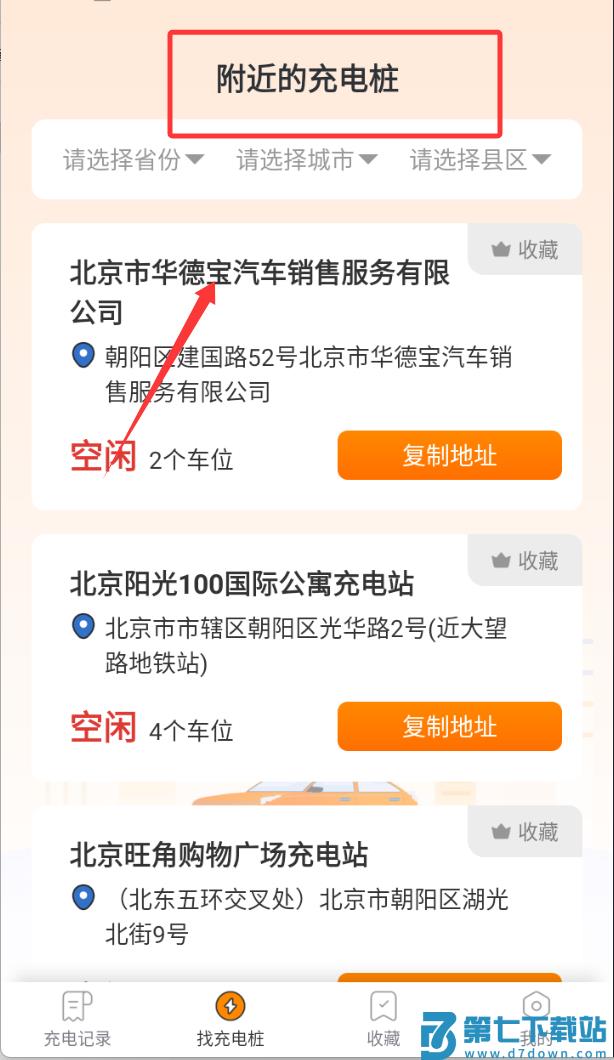 2、定位查找周边可用充电设施,显示实时状态与距离信息。