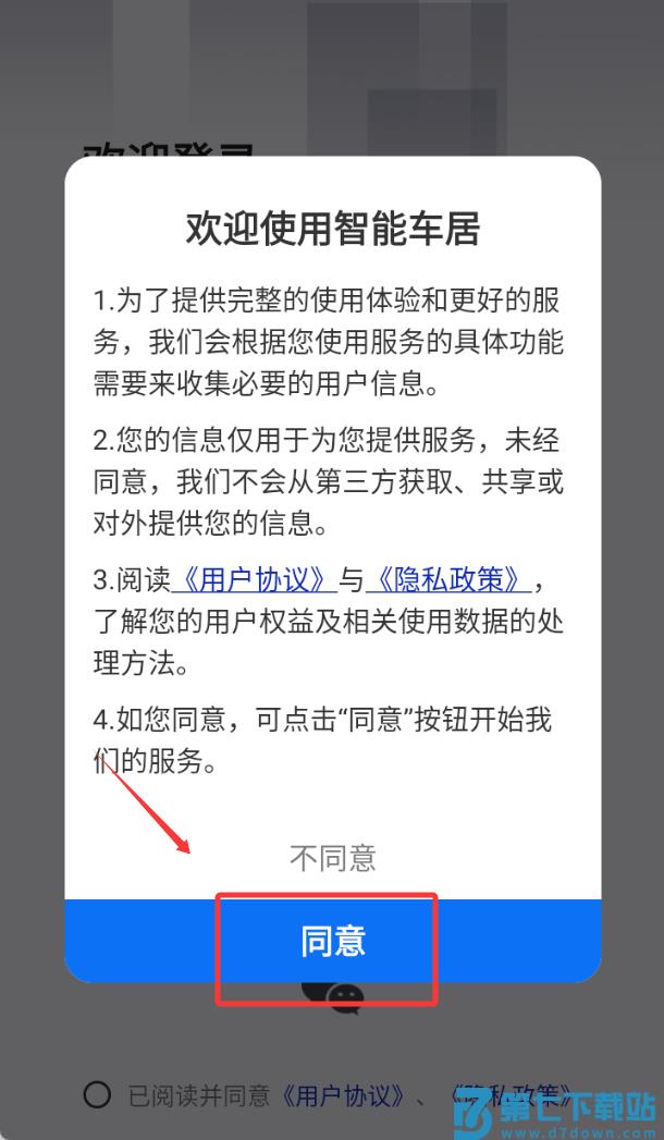 1、首先点击同意并进入应用,开启您的行车智能管理服务平台。