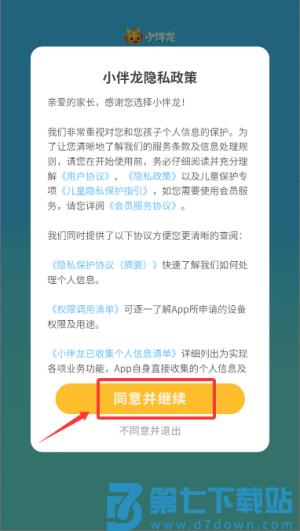 1、启动小伴龙应用,于隐私政策页面点选同意并继续操作。