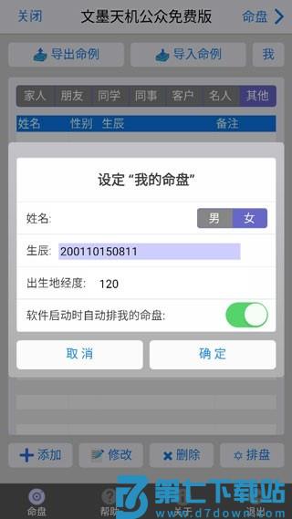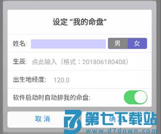 输入自己的性别、生辰、出生地经度等排盘信息,设置“我的命盘”。生辰时间是一串12位的数字,其录入结构是:四位“年”、两位“月”、两位“日”、两位“时”、两位“分”,例如2001年10月15日8点11分,录入即200110150811。出生地经度按自己实际的出生地经度填写即可。