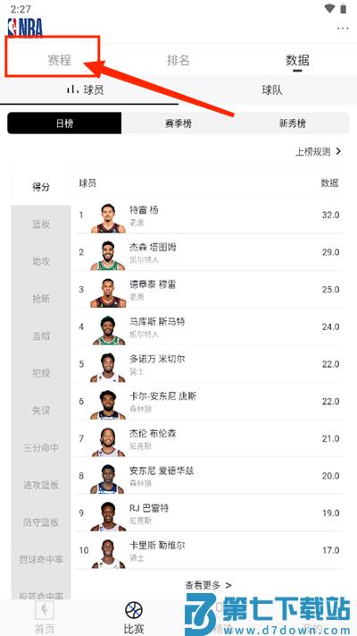 2、在比赛专栏可以看到数据、排名、赛程专栏,点击赛程;
