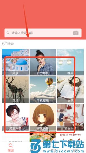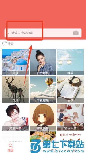 1、打开软件后可在首页搜索框输入关键词,例如风景或卡通,快速查找相关图片素材。