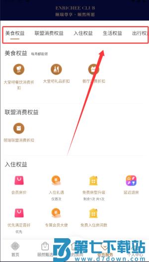 4、会员服务页面集中展示餐饮特权住宿优惠及生活服务等多项会员权益。
