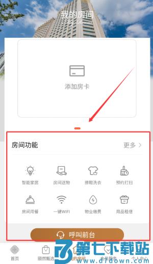 3、我的房间功能可查看客房设备使用说明并直接联系前台获取服务。