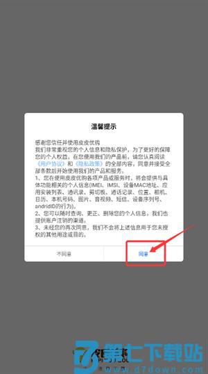 1、启动皮皮优购应用,认真阅读温馨提示后点击同意选项。