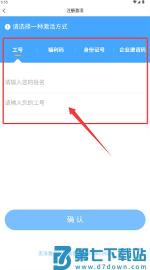4、注册激活时选择工号等方式,填写姓名与工号后确认完成激活。