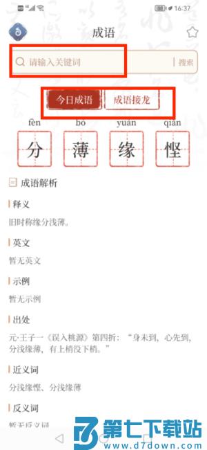 3、通过成语板块可检索词条并参与每日接龙等互动活动。