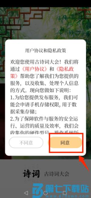 1、启动古诗词大会应用,于协议页面点选同意授权条款。