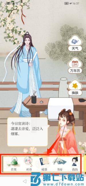 2、进入主界面可查看多功能区域,包含首页与对诗等核心选项。