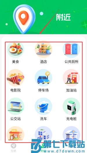 3、附近服务功能可实时显示周边餐饮住宿等设施的分布与详细信息。