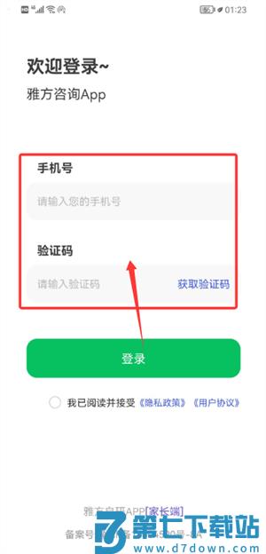 1、启动应用后,在登录界面输入手机号码,通过短信验证并勾选协议完成登录。
