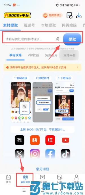1、进入应用后点击素材提取,粘贴链接即可获取素材。