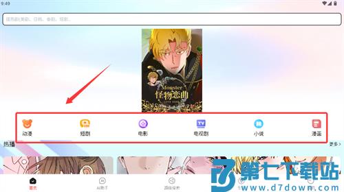 1、启动应用后,首页显示动漫、短剧等分类标签,点击动漫入口进入。