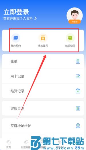 2、主界面清晰呈现预约挂号、当日挂号、诊间结算、历史就诊记录及电子健康档案入口。
