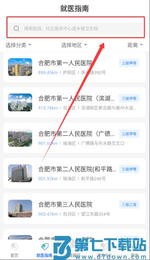 3、就医指南板块支持按名称或区域搜索合作医院、社区卫生服务中心等医疗机构信息。