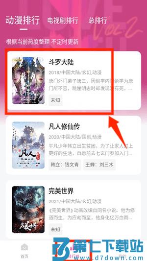 3、切换到“排行榜”页面选择动漫榜单,可查看“斗罗大陆”等热门作品的人气排名。