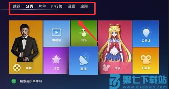 2、通过顶部导航栏的推荐、分类等标签,可快速浏览各类影视资源。