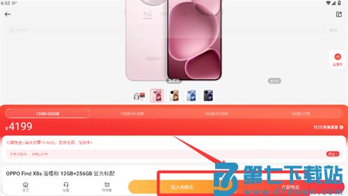 4、选定所需商品后,例如OPPOFindX8落樱粉版,可加入购物车或直接购买。