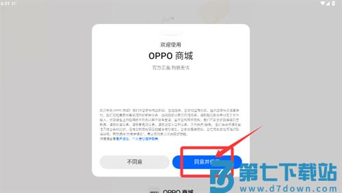 1、启动oppo商城,在用户使用协议弹窗中点击"同意并使用"。