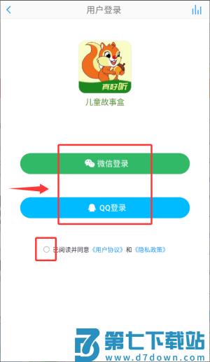 2、于登录界面勾选用户协议与隐私政策,选择微信或QQ登录。