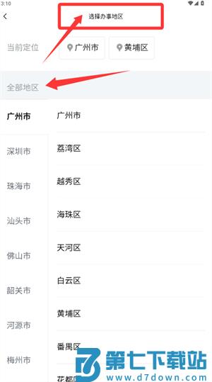 2、在地区选择页面,从全部区域中定位具体城市及下属辖区。