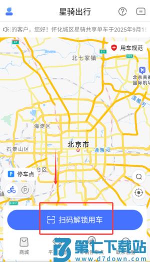 星骑出行用户端,主要提供给车辆租赁的用户使用,提供我的账户,常见问题以及系统设置模块。用户可以在首页进行扫码解锁用车,搜索目的地还车点,切换显示车辆位置和停车点位置,定位自己的位置,以及联系客服。