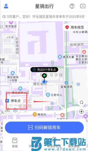 4、停车点查看服务以地图模式展示周边所有合规停放区域的具体位置。标注有站点容量及当前车辆数量,支持导航指引功能。
