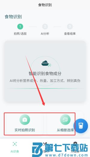 3、AI识食功能支持实时拍摄食物照片或从相册选取现有图片,进行智能识别分析。