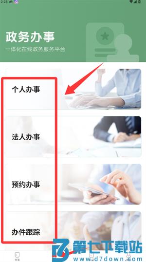3、办理政务事项可点击底部办事,选择个人或法人服务类别。