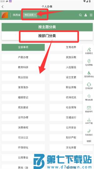 4、进入个人办事后,先选地区再按部门查找户籍办理等事项。
