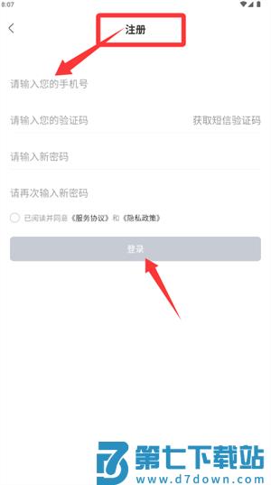2、在注册页面填写手机号及验证码,设置登录密码并确认提交。