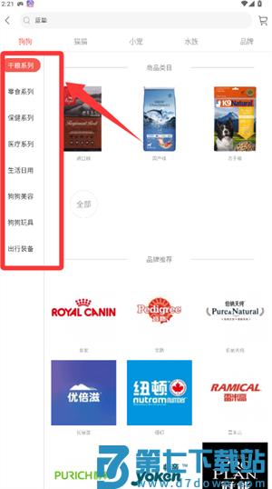3、按宠物种类选择狗狗等类别,再挑选干粮等具体细分品类。