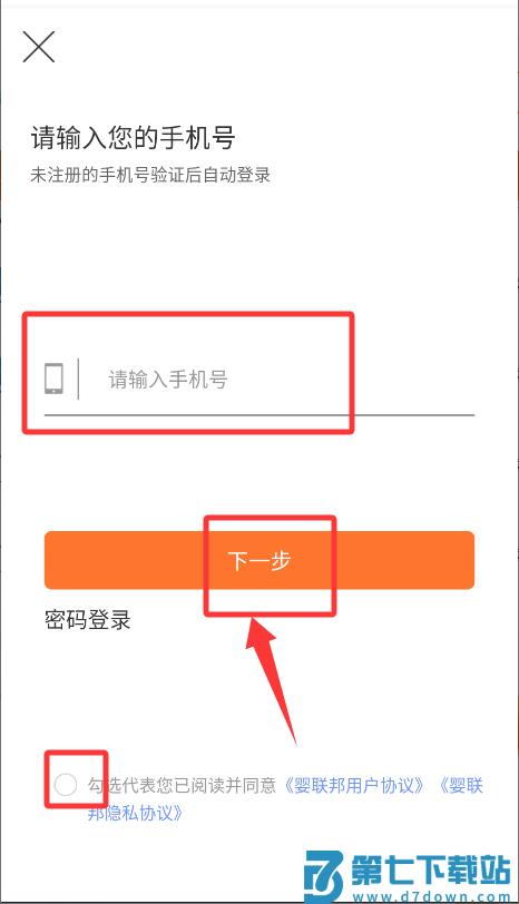 2、输入手机号并勾选协议,点击下一步完成登录。