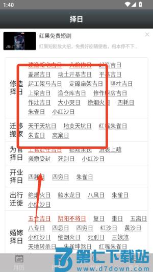 1、打开易学万年历选择日期,主界面会显示当日宜忌事项和黄历基本信息供你参考。