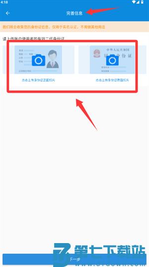 2、进入资料完善界面,依次上传身份证正反面图像,完成实名认证流程。