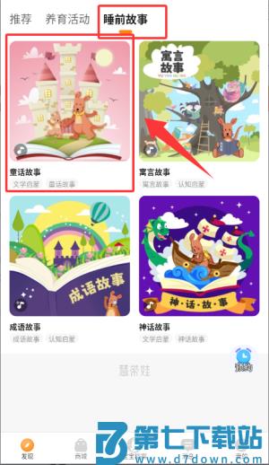 4、切换至睡前故事板块,选择童话故事等类别收听。
