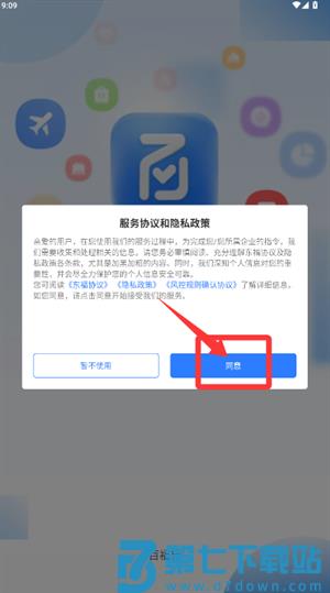 1、启动应用,在服务协议弹窗中点选同意选项继续操作。