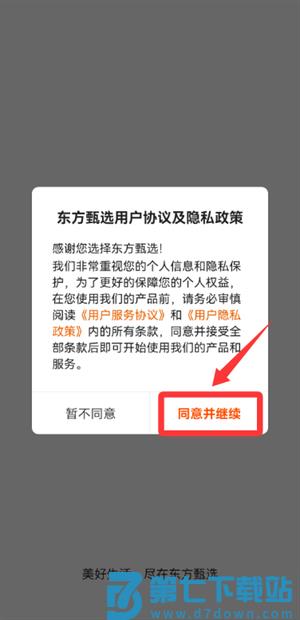 1、启动应用,在用户协议弹窗中点选同意并继续选项。
