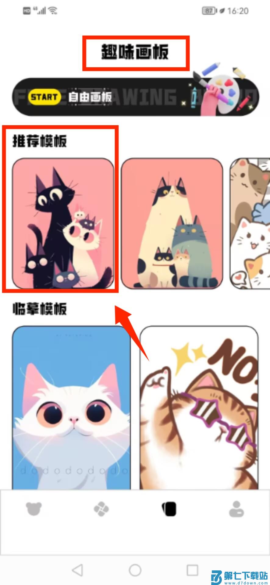 2、切换至趣味画板功能区,在推荐图库中选取喜欢的猫咪样式模板。