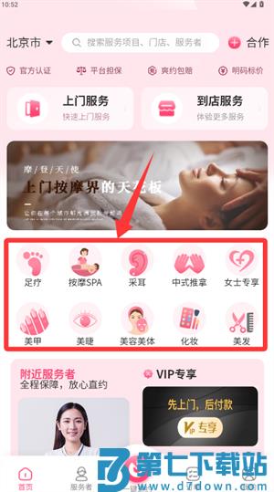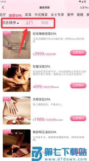 2、在首页分类中找到所需服务,例如按摩或SPA等项目。
