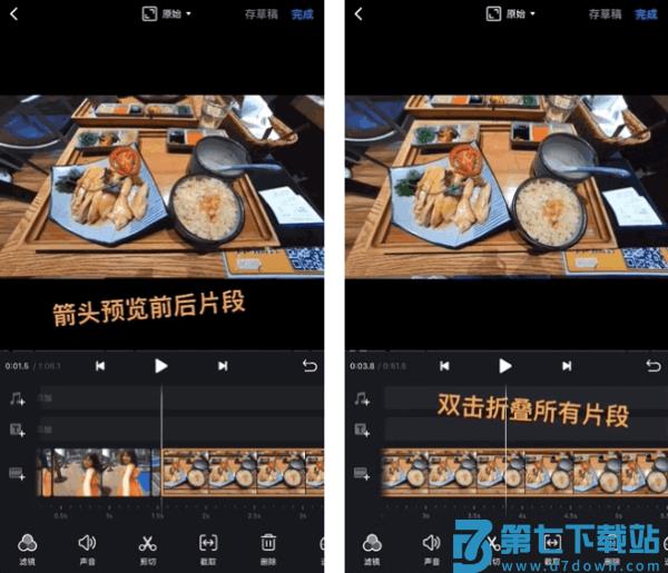 2、如果素材太多,双击片段就能迅速折叠素材,找到你想要编辑的片段,双击或双指展开就可以啦,是不是省了很多反复拖动素材的时间呢?
