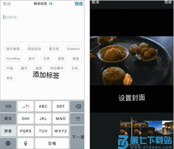 【删除排序】向上、向下划动删除,长按拖动排序;支持多视频/图片,无时长限制;