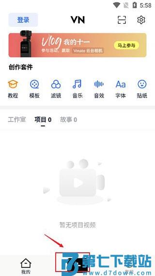 打开vn视频剪辑app后,在主界面点击底部中间的【+】;