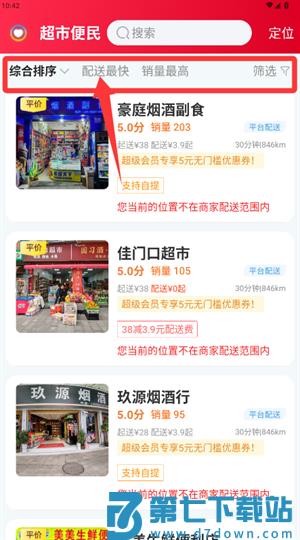 3、在该页面根据配送速度等条件排序,筛选合适的超市。