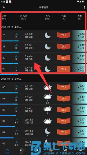 3、选择具体地点如东平渔港,查看逐小时天气、风力及温度详情。
