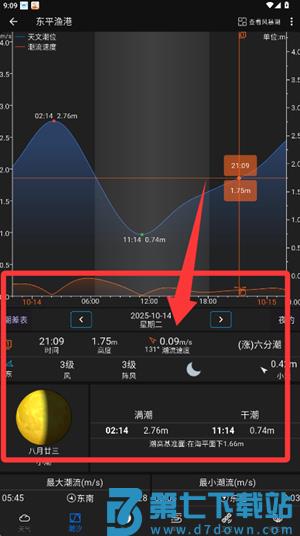 4、进一步浏览该位置的潮汐数据,包含潮高流速等图表化信息。