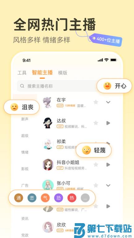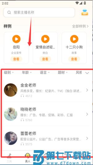 2、点击主播按钮展开声音库,根据场景选择适合的发音人,比如儿童故事选萌趣声线,广告选用沉稳声线。
