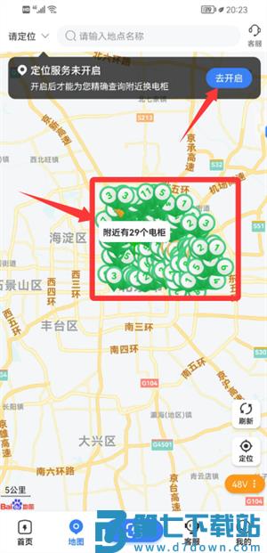 4、进入附近电柜页面需开启定位权限,即可查看周边所有换电网点分布。