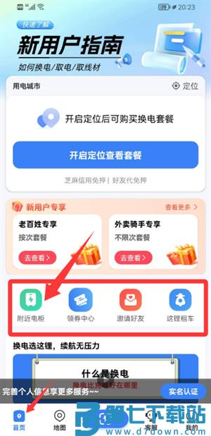 3、成功登录后可在首页查看附近电柜位置,或访问领券中心等区域。